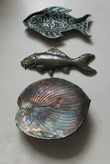 Carved Raku Fish Dish $75, Glazed Ceramic Fish $45